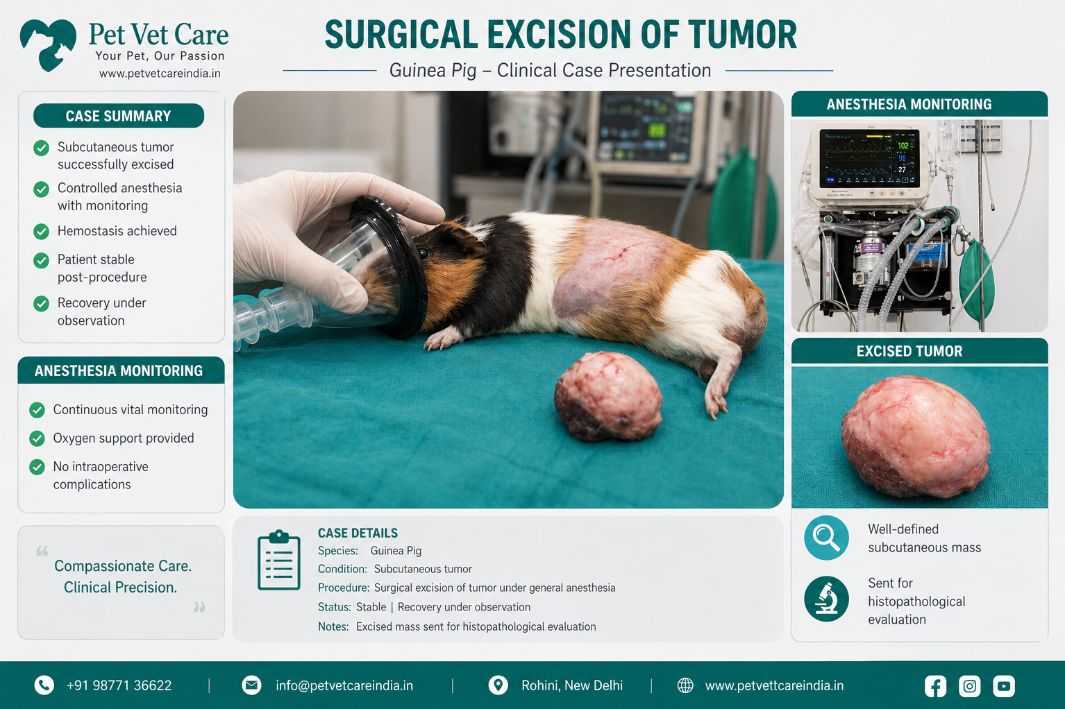At Pet Vet Care India, we provide compassionate veterinary care for guinea pigs and other small animals. Whether your pet has a swelling, suspected tumor, or a mass that needs surgical removal, early consultation can help you make the right decision with confidence.